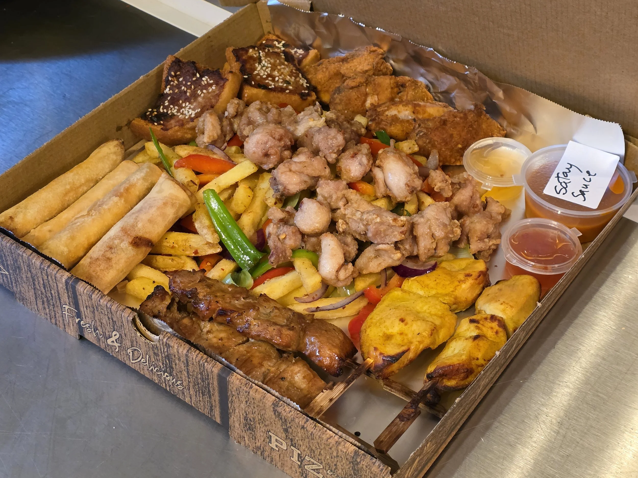 Meet the Mega 12" Combo: 2 veg spring rolls + 2 meat spring rolls, BBQ pork skewers + chicken satay skewers, hot & spicy wings, pork toast, chicken bites, and salt & pepper chips — basically the “can’t-pick-just-one” feast